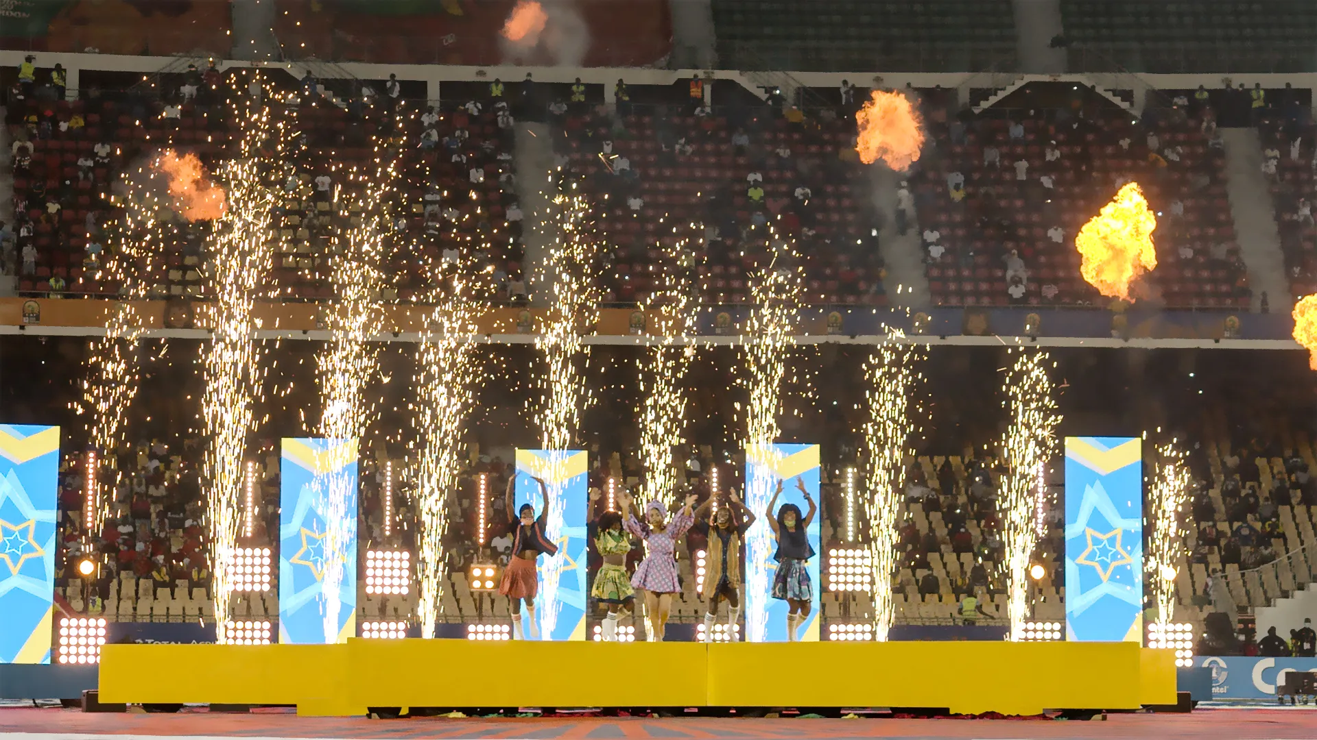 The pitch was decked out in a massive colorful African cloth with dancers thumping the floor in various dress cultures of the country amid huge firework display.