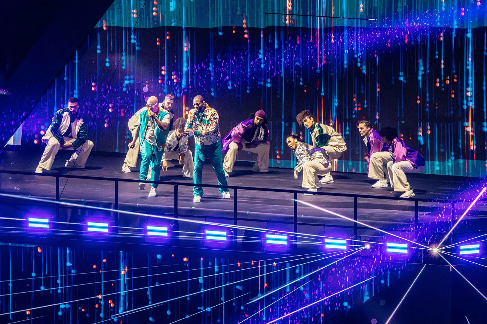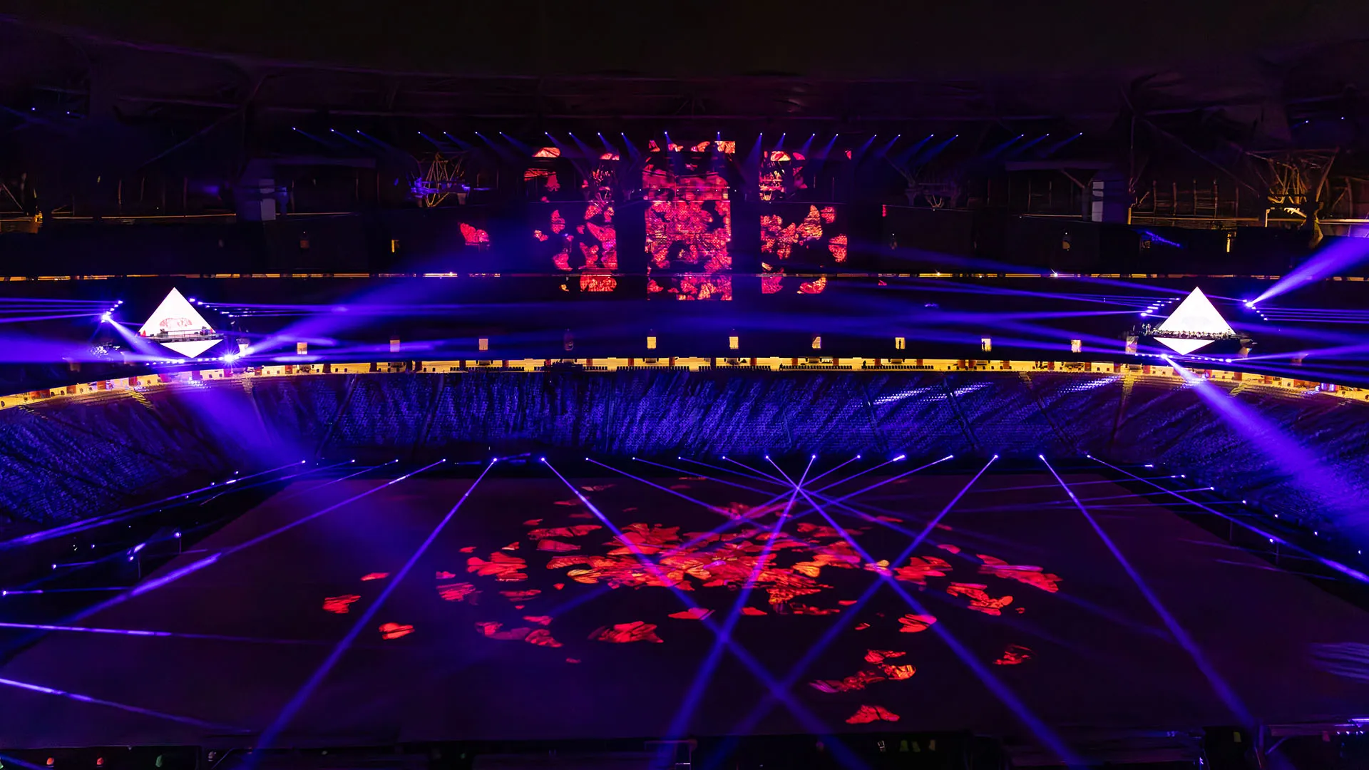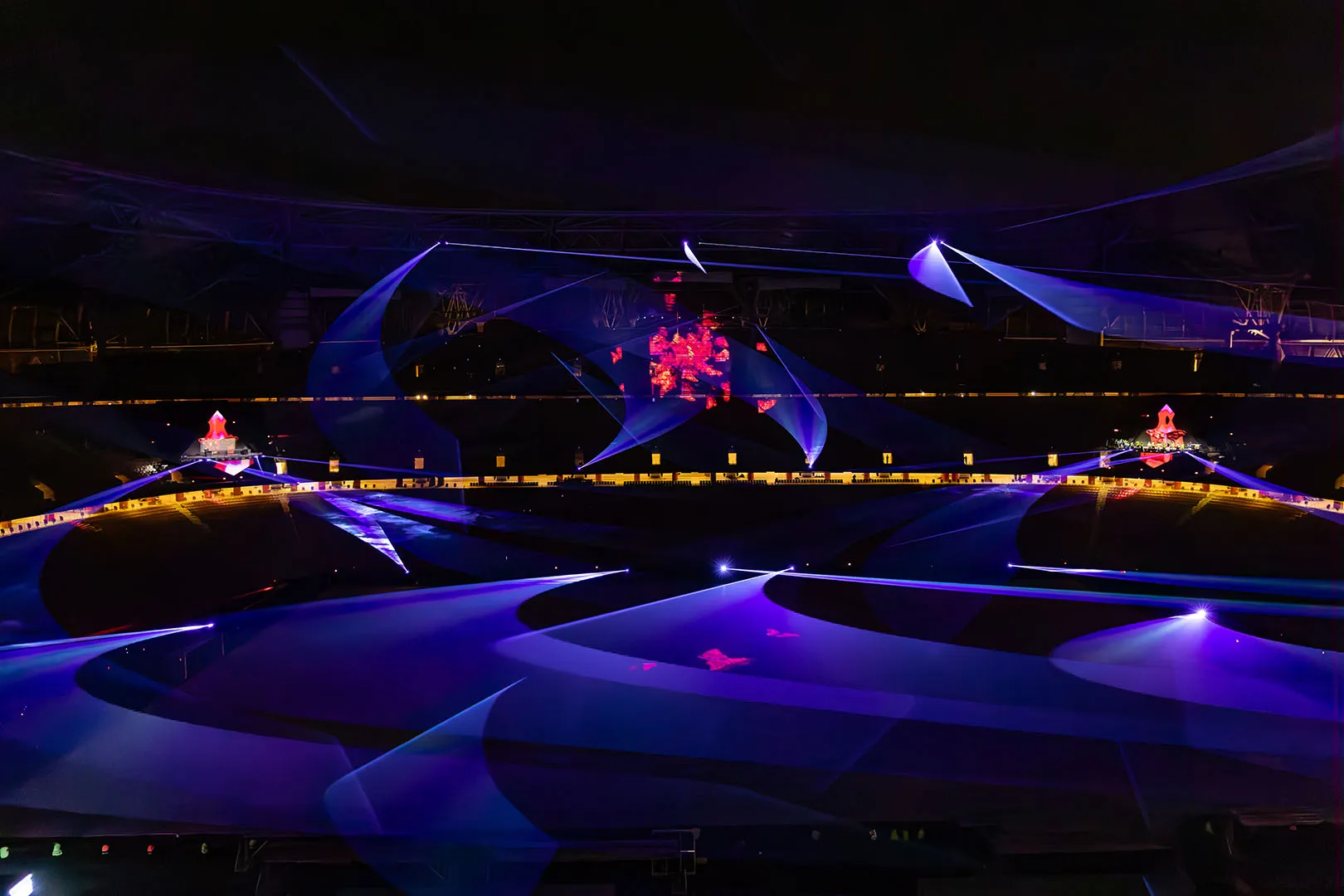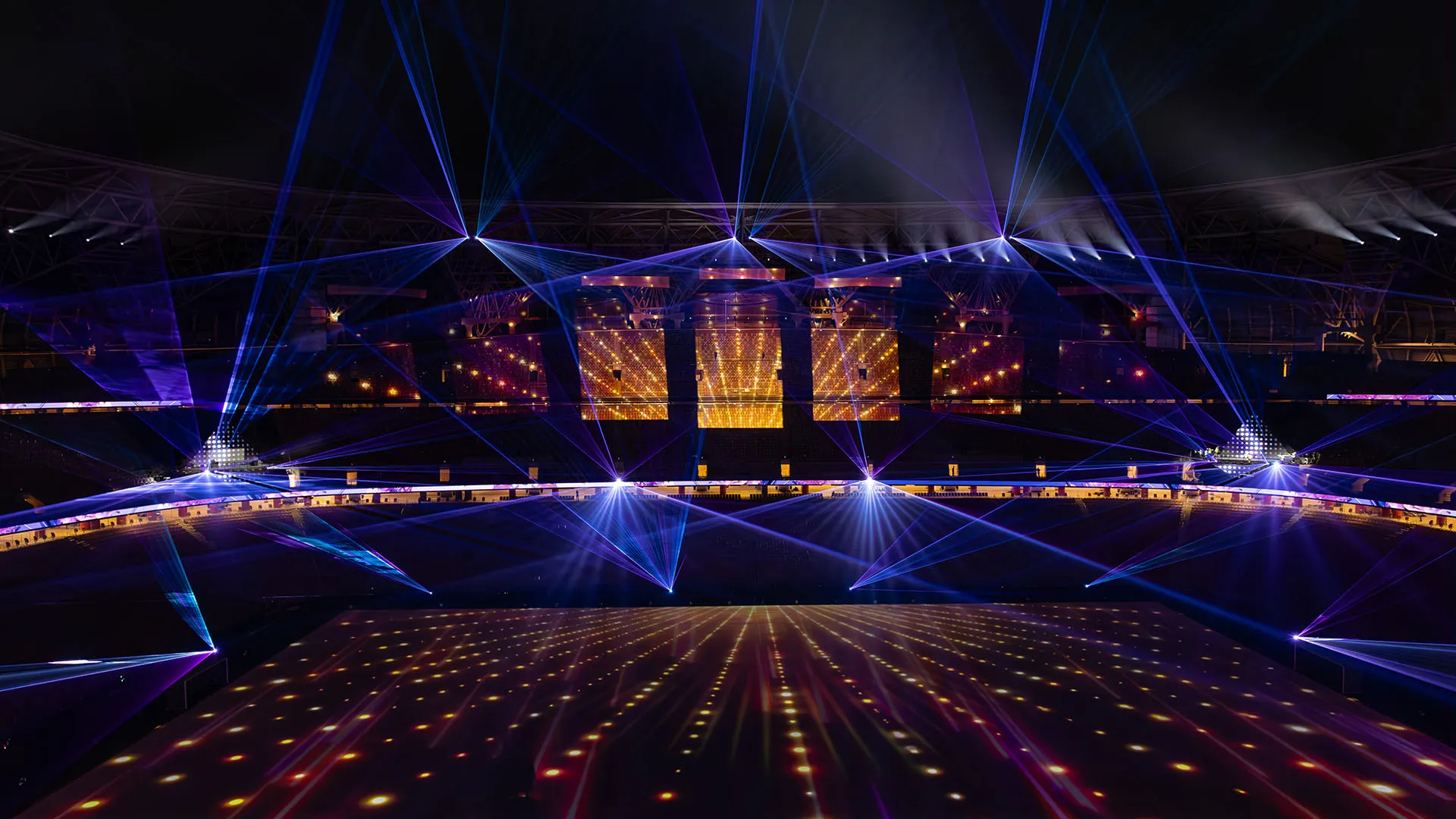 The Opening Ceremony was spectacularly headlined by Swedish House Mafia and Busta Rhymes. Their performances, on two monumental triangular stages in the stands, along with 360° of video projection, lights, and SFX, electrified a record- breaking crowd of +50,000 spectators and 80M viewers.